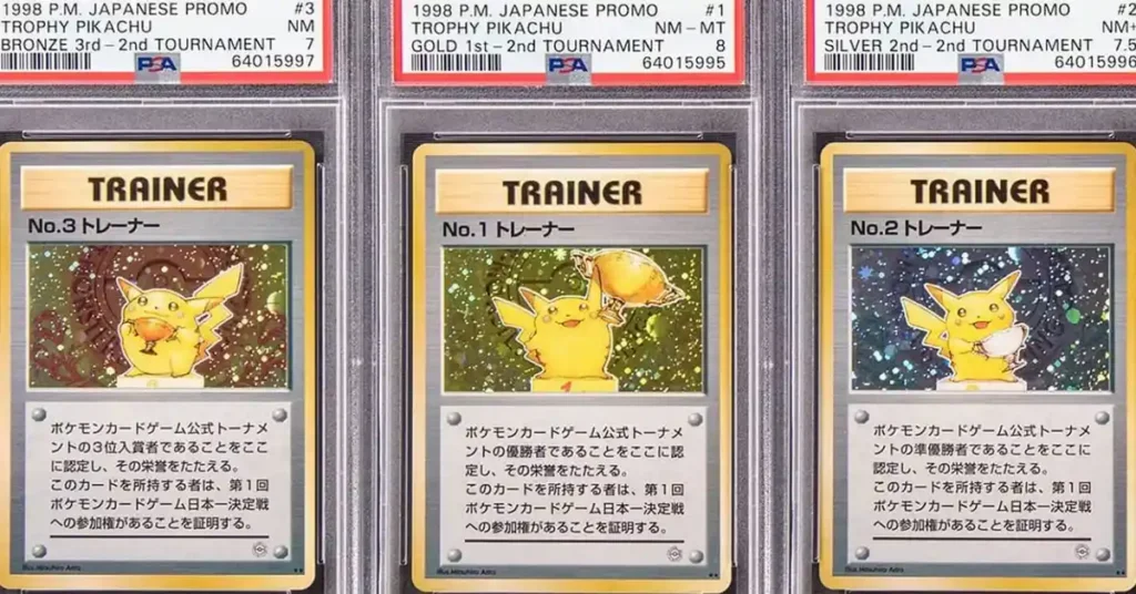Les cartes distribuées comme récompenses lors des championnats du monde et autres tournois Pokémon comptent parmi les plus rares. Leur nombre d’exemplaires se limite souvent aux trois meilleurs joueurs de chaque compétition.