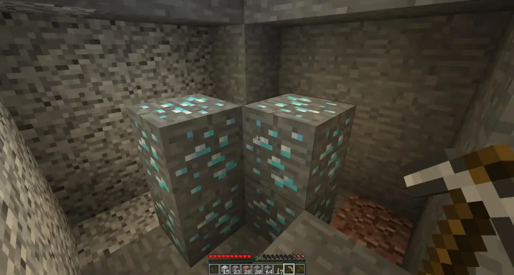 Quand vous trouvez un filon, sécurisez d’abord la zone. Éclairez les alentours, vérifiez qu’aucune poche de lave ne menace vos précieux minerais, puis récoltez tous les diamants du filon avant de continuer.