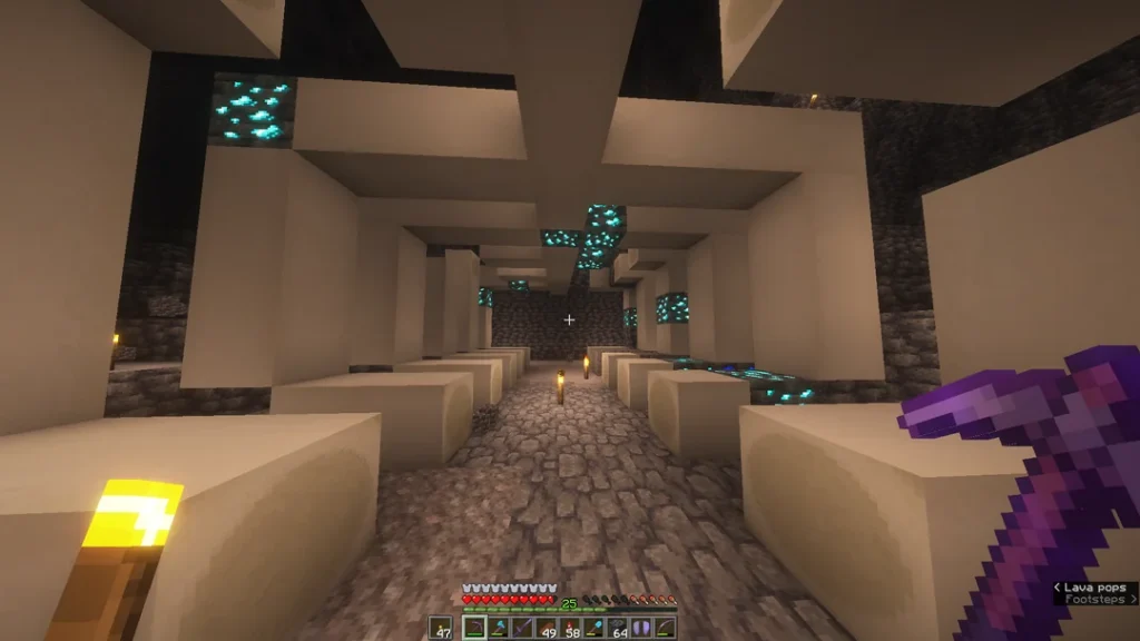 En dessous de la couche 0, le minerai de diamant prend l’apparence du minerai de diamant des abîmes (plus sombre). Il est légèrement plus long à miner, mais donne exactement les mêmes récompenses. Ne l’ignorez pas sous prétexte qu’il paraît différent.