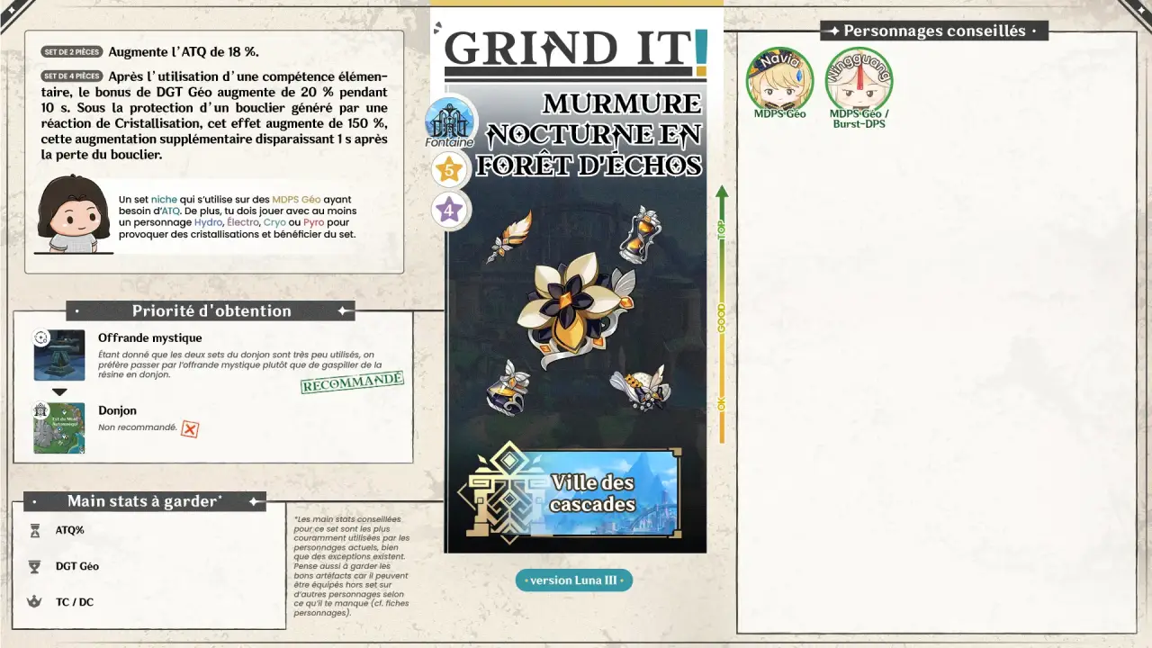 Navia s’impose comme un DPS Géo de type burst qui apporte une approche rafraîchissante aux compositions Géo. Son efficacité repose sur trois piliers fondamentaux : prioriser l’ATQ et les statistiques Critiques, équiper le set Murmure nocturne en forêt d’échos, et composer une équipe avec deux applicateurs élémentaires off-field.