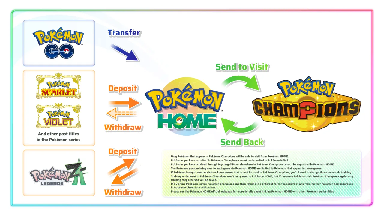 Pokémon Champions sera compatible avec Pokémon HOME, le service cloud disponible sur Switch, Switch 2 et appareils mobiles. Les dresseurs pourront transférer leurs Pokémon depuis Écarlate et Violet, Légendes : Z-A ou encore Pokémon GO en tant que « visiteurs ». Seuls les Pokémon présents dans le roster du jeu seront acceptés, et ceux obtenus directement dans Champions ne pourront pas être renvoyés vers HOME.