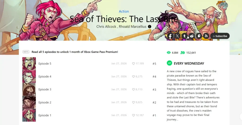 L’opération ne s’arrête pas au Game Pass Premium gratuit. Les membres Xbox Game Pass (peu importe le palier) peuvent aussi réclamer un mois de Webtoon Premium offert via le hub Avantages de leur console Xbox, l’application Xbox sur PC ou sur mobile. Ce Webtoon Premium comprend 100 crédits mensuels pour débloquer des épisodes, 10 crédits bonus, la lecture sans publicité et un coupon de 15% sur certains achats.